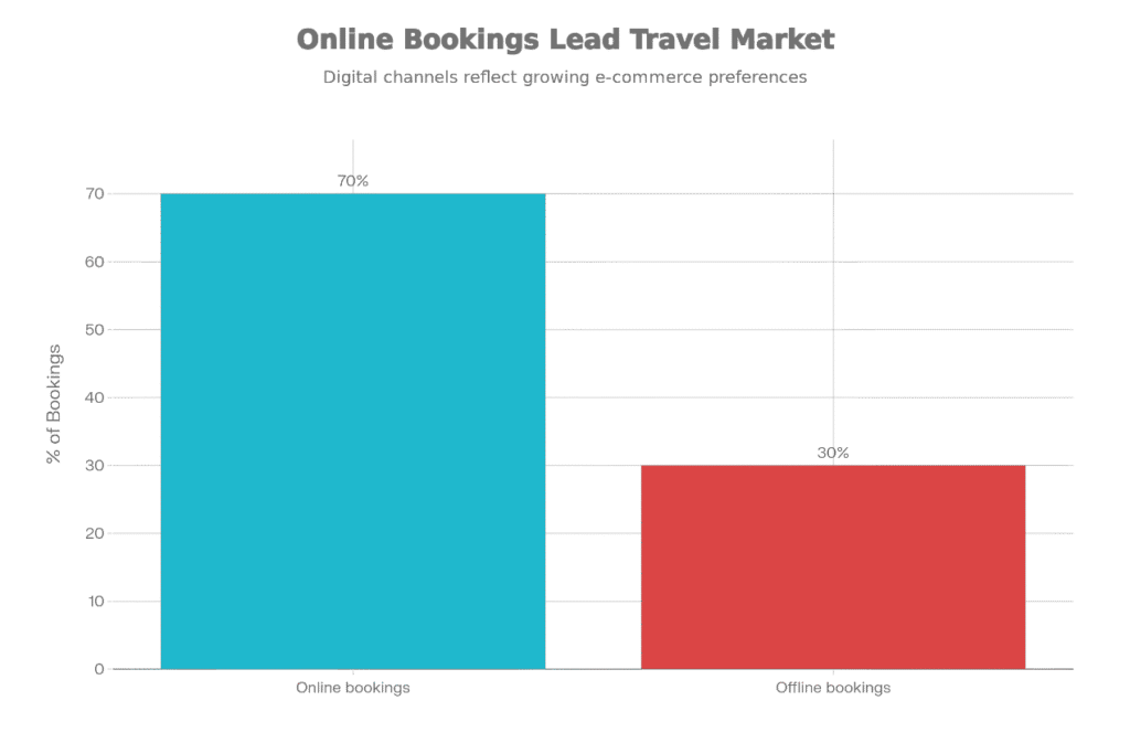 Digital transformation in travel is clear when comparing online and offline booking preferences. The chart below illustrates a simple split where online channels take the majority share of bookings.