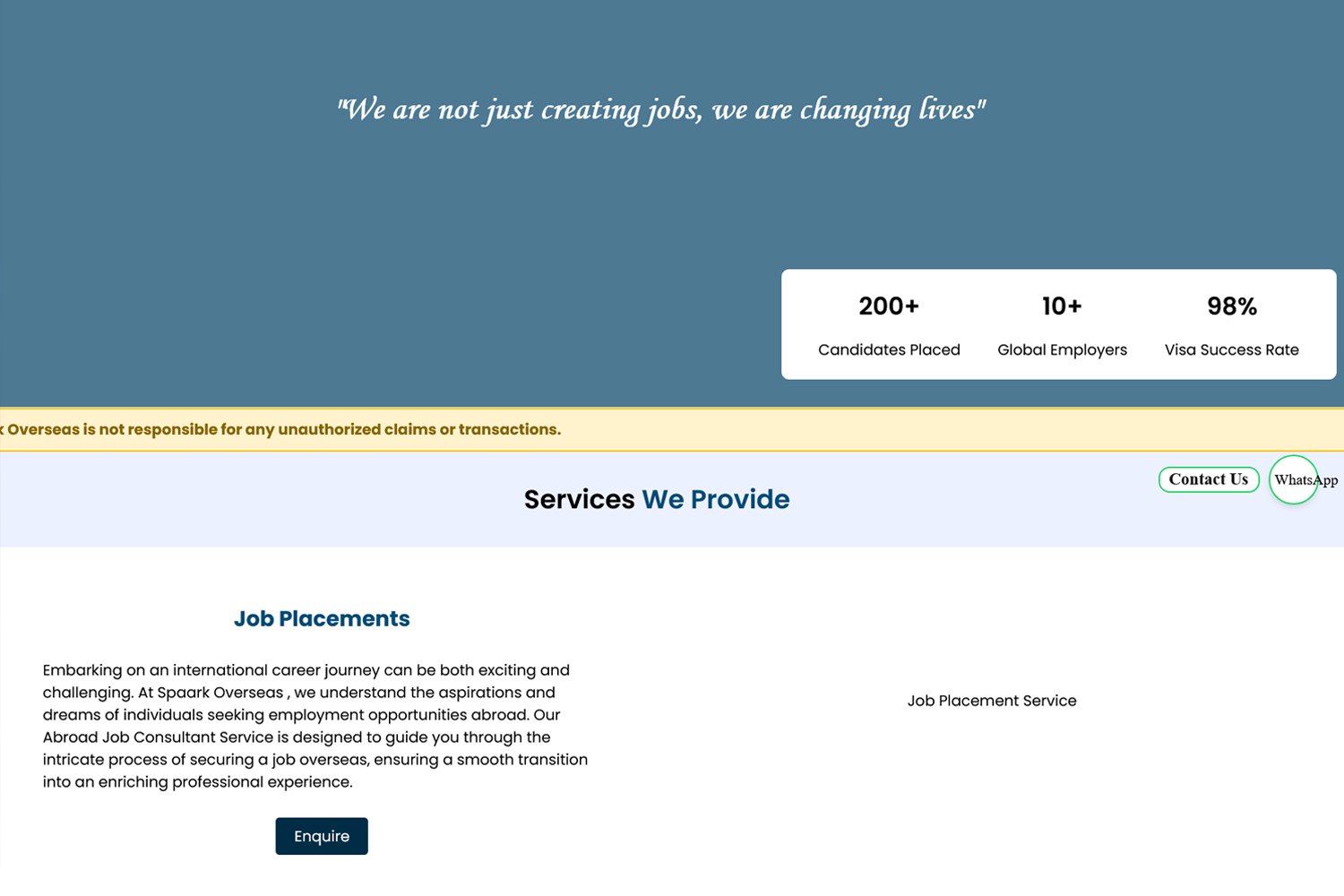 Spaark Overseas isn’t just a recruitment agency; it’s a life-changing partner for nurses and physiotherapists. To reflect CEO Abhay Kumar’s mission, the redesign moved beyond standard “job board” aesthetics.